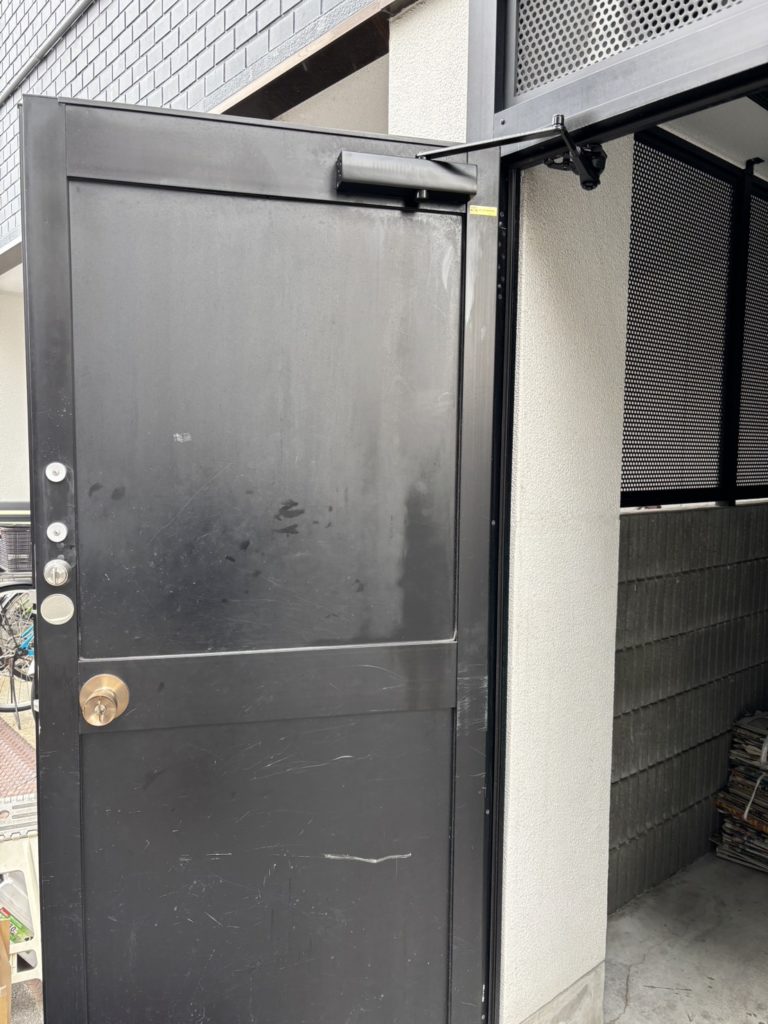 そこで、今回の錠前変更に合わせてドアクローザーの交換することで、確実にドアが閉まるので、住人の方が意識しなくてもゴミ出しの後にはカギが掛かっている状態になるようになりました。