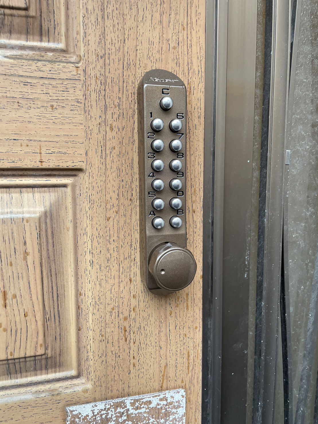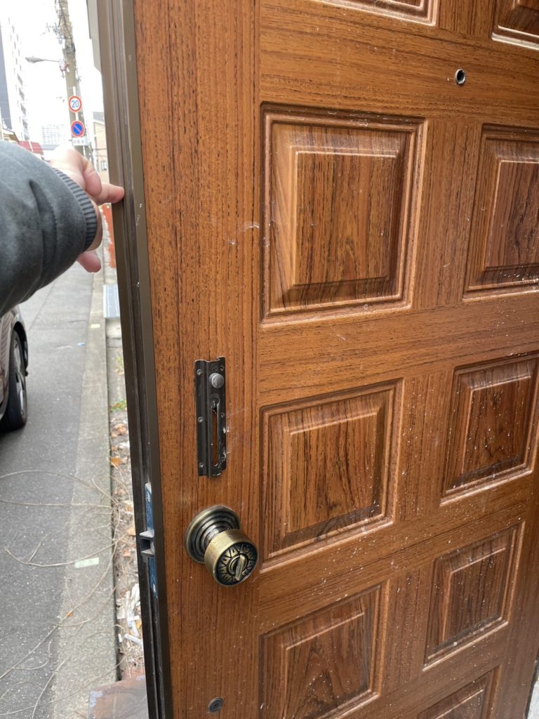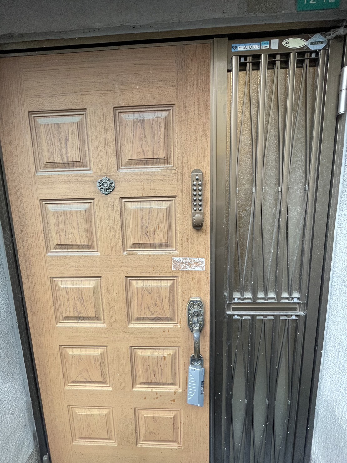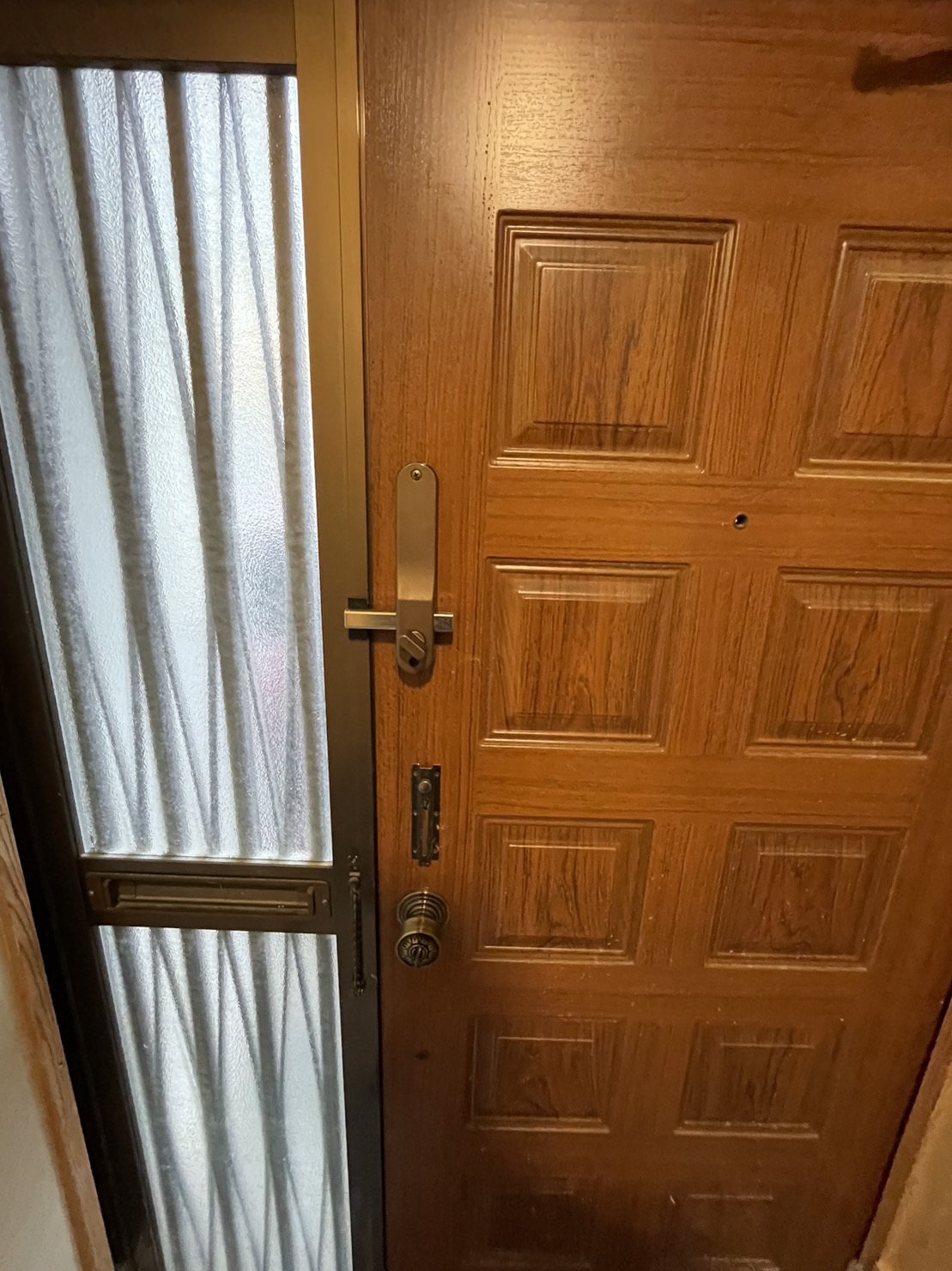 既設の装飾錠(サムラッチ錠)は引き続きハンドルとして残したまま、その上に面付補助錠タイプのキーレックス500を新規設置しました。