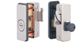 限られた構造部分に設置するには、画像のような本体幅の狭いものや、鎌状のカンヌキになったもの、サムターン(室内つまみ)の脱着できるものなどが望ましく、使い勝手などにより各種あるのでご相談ください。